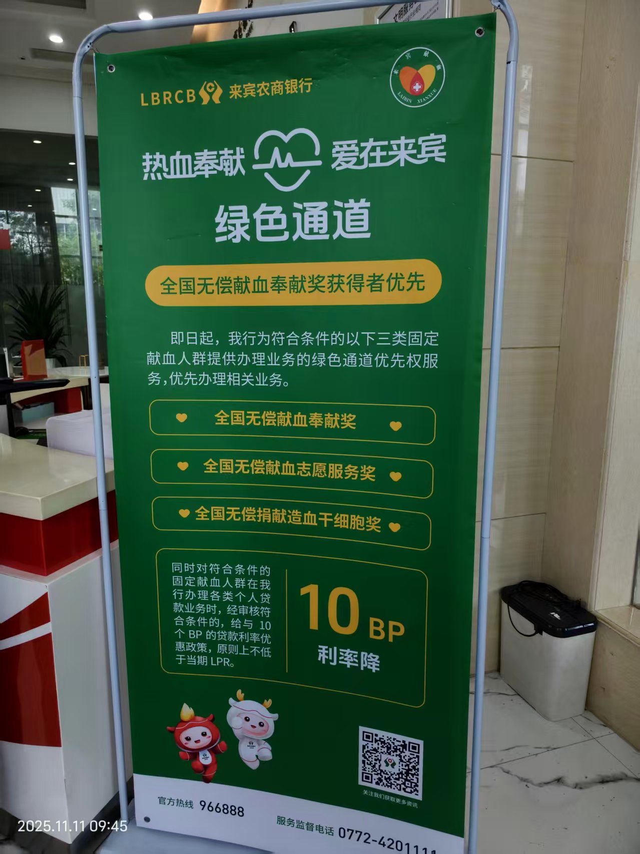 此次合作明确,全国无偿献血奉献奖、志愿服务奖、无偿捐献造血干细胞奖获得者,可在来宾农商银行市区 10 个营业网点的 VIP 柜台享受优先办理业务的 “绿色通道”,无需排队即可快速办理;同时在符合贷款条件的前提下,可享 10 个 BP 的贷款利率减点优惠(不低于当期 LPR)。