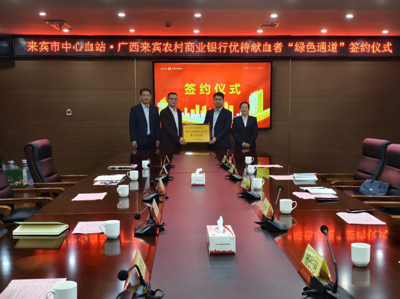 11 月 11 日,来宾市红十字会、来宾市中心血站与广西来宾农村商业银行(简称 “来宾农商银行”)联合举办 “热血奉献 爱在来宾” 签约仪式,为全国无偿献血相关奖项获得者推出专属金融服务 “绿色通道”。